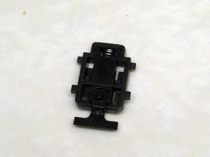 For years every time I would print, the system would tell me that there was a problem with my black print cartridge. Finally this week my printer was not recognizing the brand new black cartridge. On closer inspection, I found that the cartridge holder was broken. A small "T" shaped plastic part had snapped off. I suspect that it has been malfunctioning for years. Close-up of printer cartridge holding mechanism. Unfortunately I didn't shoot a picture of it broken and installed. See photos below for installed repair. The "T" portion was broken off. The top of the "T" actually provides pressure for the cartridge holding is in place. You can see the excess glue on the repair. This component is held in place by a conical shaped spring. Compressing the spring allows easy removal of this mechanism. |