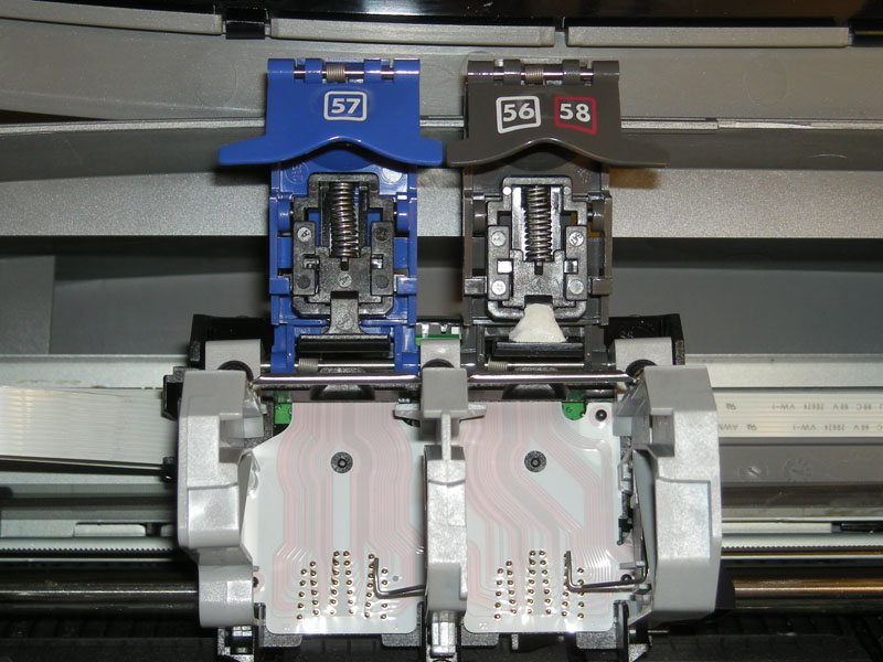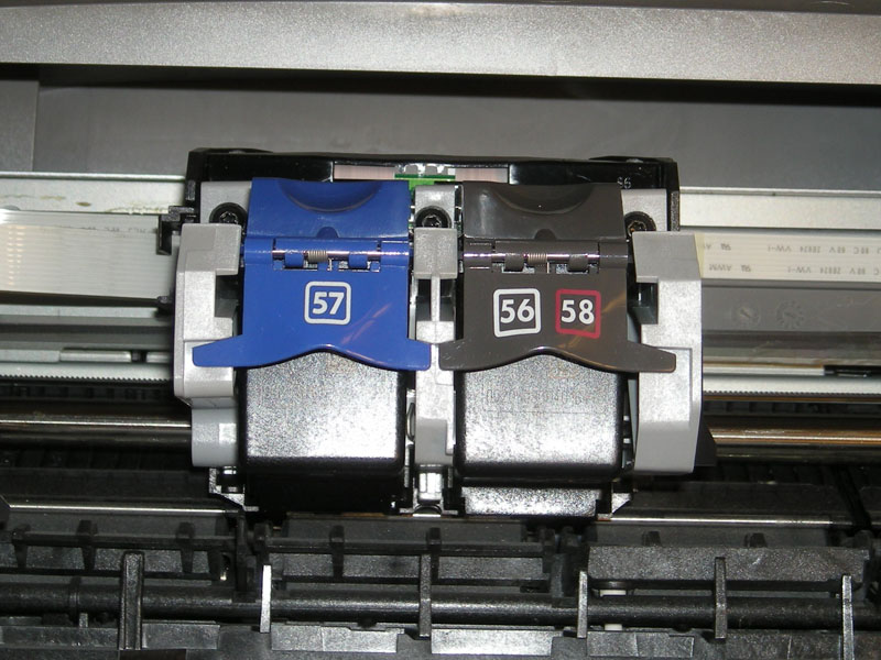 Here they are installed back in the printer carriage. The 56-58 holder has been repaired, the 57 holder is original. |